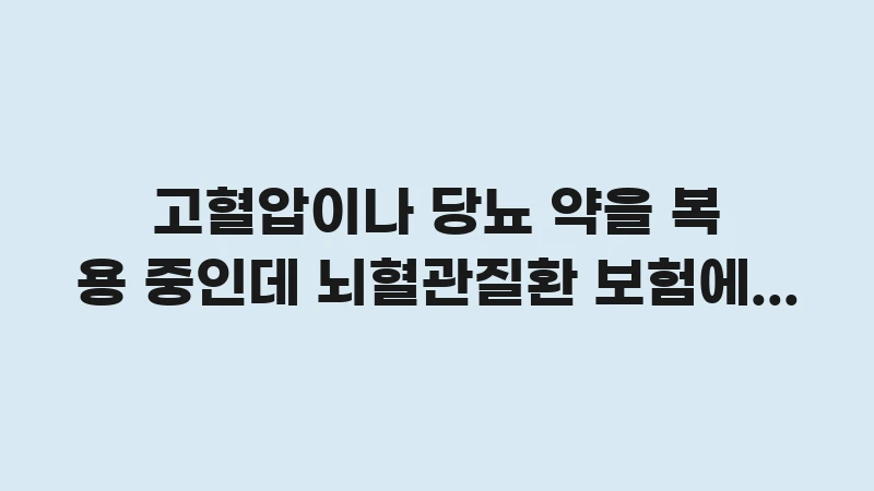... 더 읽기고혈압 당뇨 약 복용 뇌혈관질환 보험 가입 가능 여부: 약을 복용 중인 유병자를 위한 간편 심사 보험의 가입 조건과 알릴 의무 사항을 명확히 제시합니다. 만성 질환 관리와 뇌혈관질환 대비를 동시에 하는 방법을 확인하세요.