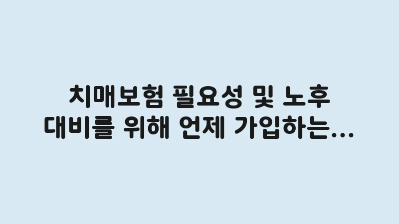 ... 더 읽기치매보험 필요성 및 노후 대비를 위해 언제 가입하는 것이 가장 좋은지 고민하고 있나요? 평균 수명 증가와 치매 발병률 데이터를 근거로 왜 치매보험이 필수적인지 분석했습니다. 젊을 때 가입해야 하는 조기 가입의 3가지 경제적 이점과, 가입 시기별 전략을 상세히 제시하여 독자의 상황에 맞는 최적의 가입 시점을 안내합니다.